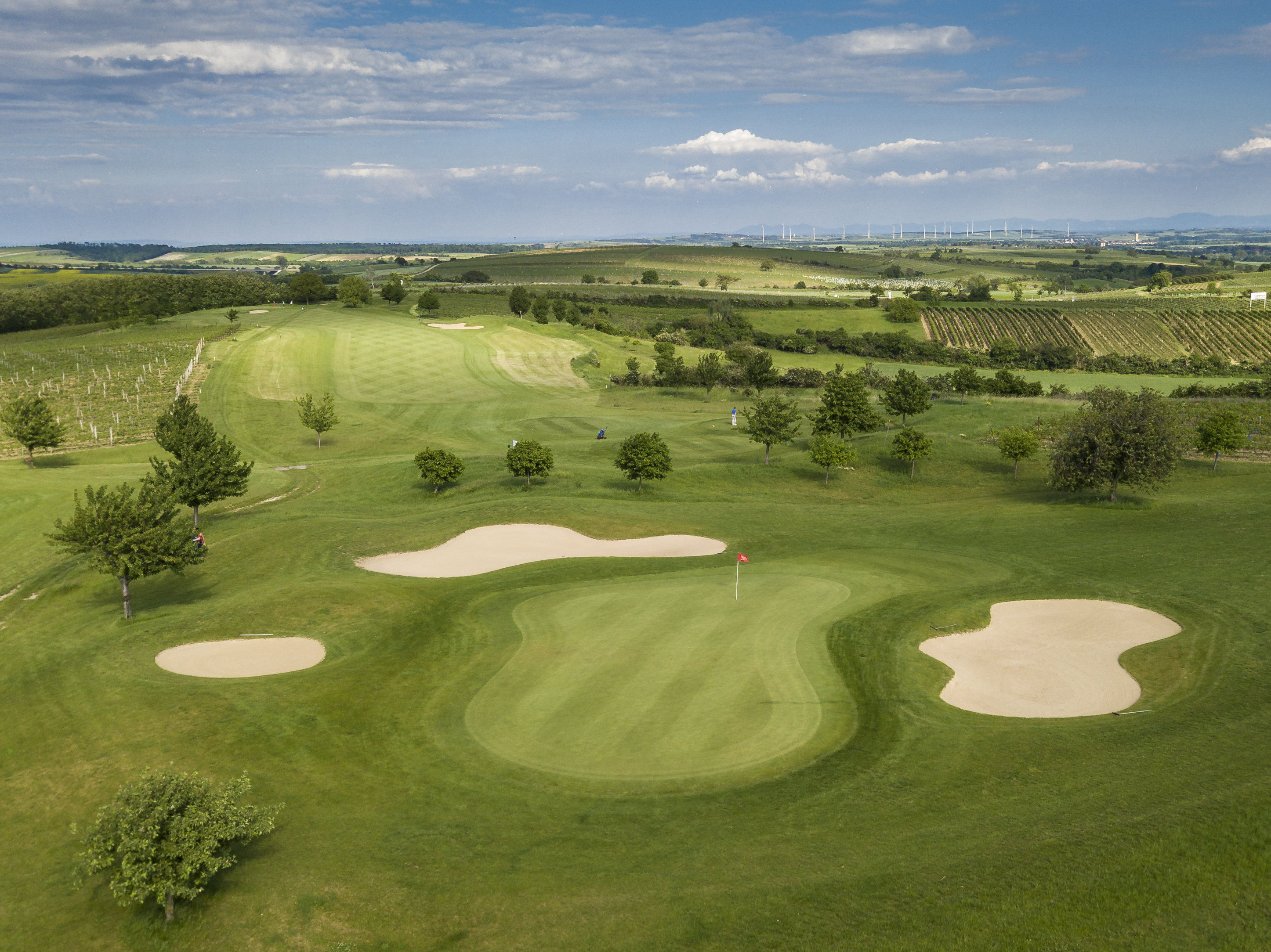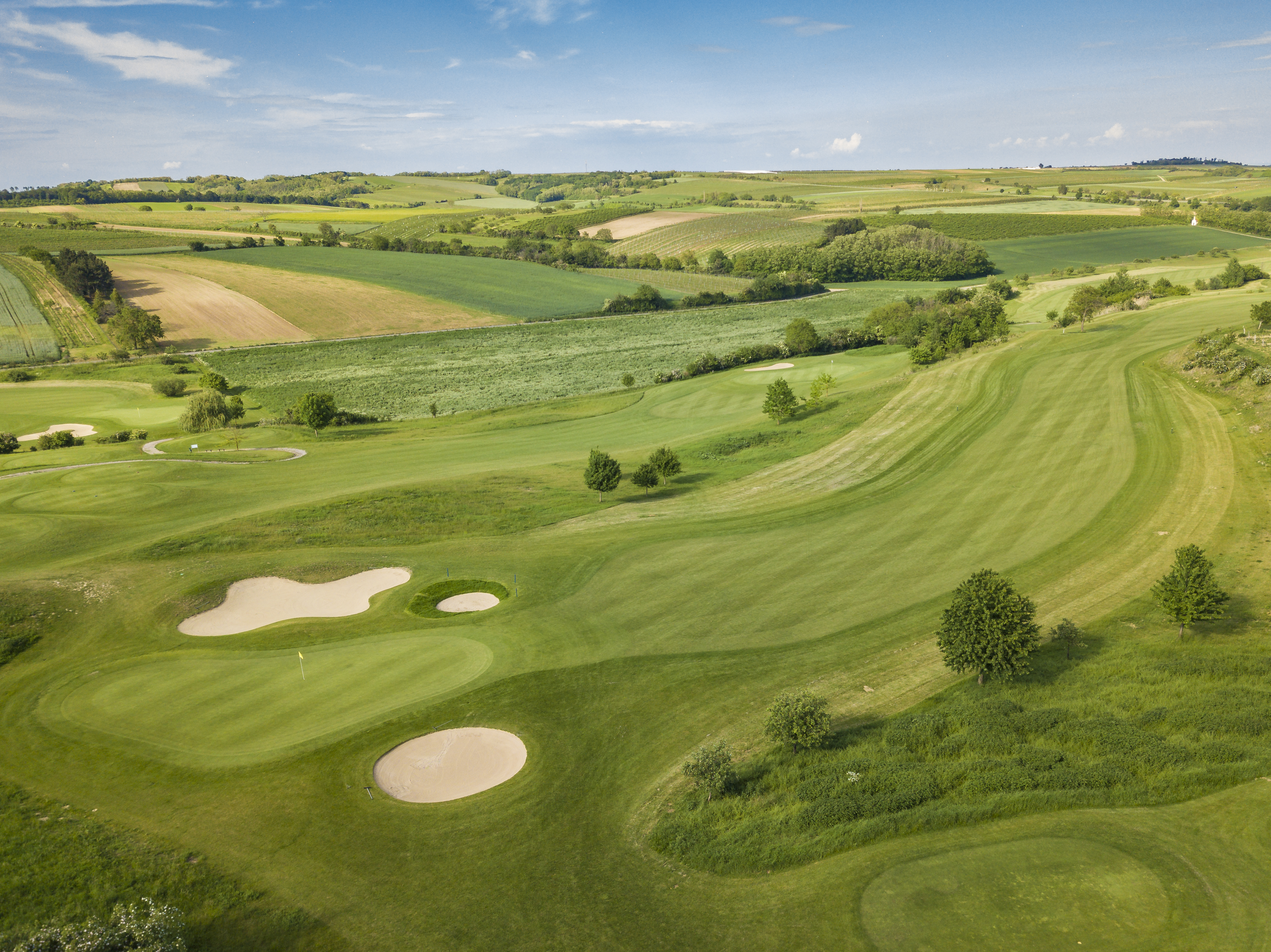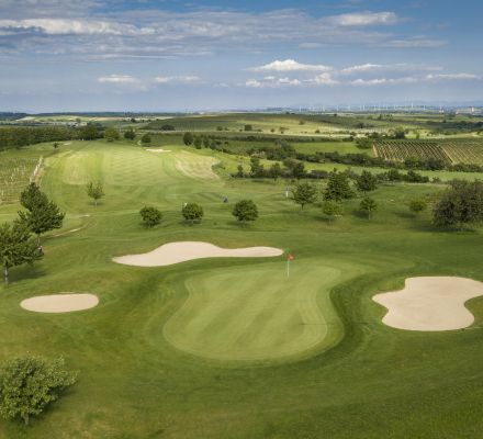 The 18-hole golf course Veltlinerland is harmonically embedded into the gentle curves of the vineyards.